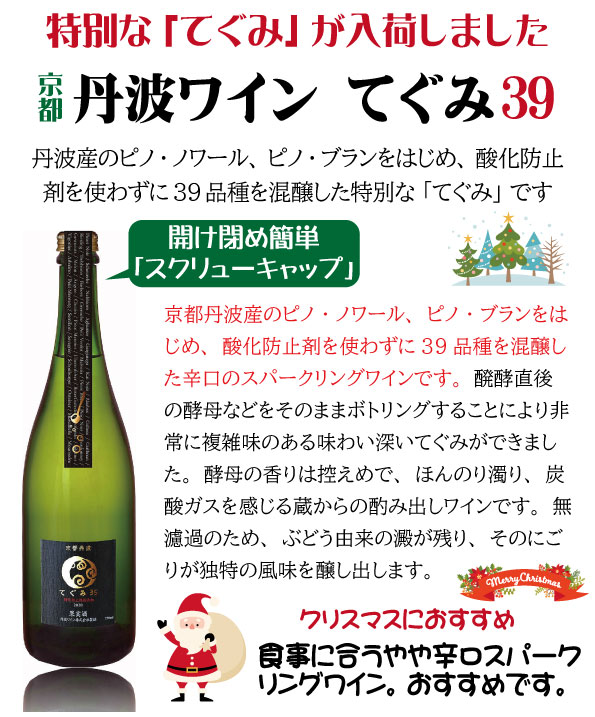 京都 丹波ワイン てぐみ39 スパークリングワイン 酸化防止剤不使用◆丹波ワイン人気のスパークリングワイン 39種類のぶどうを原料にした「てぐみ39」◆京都丹波産のピノ・ノワール、ピノ・ブランをはじめ、酸化防止剤を使わずに39品種を混醸した辛口のスパークリングワインです。◆醗酵直後の酵母などをそのままボトリングすることにより非常に複雑味のある味わい深いてぐみができました。◆酵母の香りは控えめで、ほんのり濁り、炭酸ガスを感じる蔵からの酌み出しワインです。◆無濾過のため、ぶどう由来の澱が残り、そのにごりが独特の風味を醸し出します。◆原材料/ぶどう(39種類)◆タイプ/白泡、辛口◆アルコール度/11度◆醸造元/京都 丹波ワイン◆スクリューキャップ使用